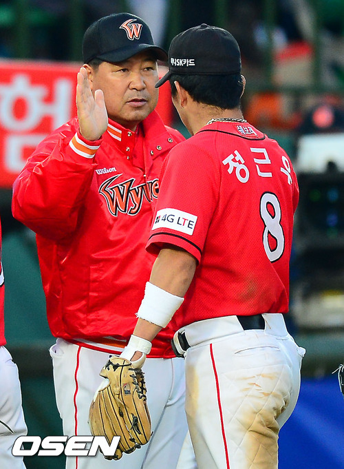 경기를 마치고 SK 이만수 감독과 정근우가 하이파이브를 하고 있다. / rumi@osen.co.kr
