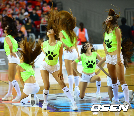 전자랜드 치어리더들이 코트 위에서 화려한 공연을 펼치고 있다..