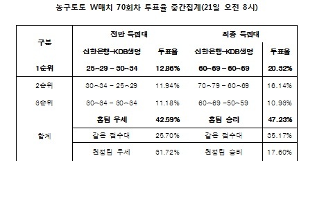 2012-2013시즌 농구토토 W매치 70회차 투표율 중간집계 결과