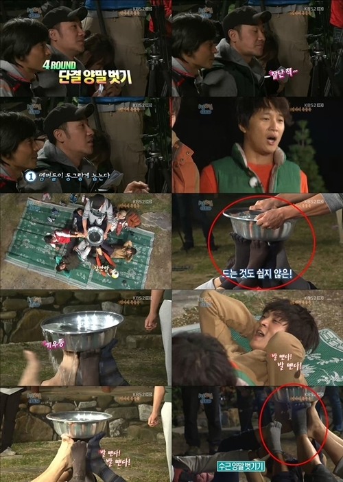 엄태웅이 소개한 게임은 바로 단결 양말 벗기 게임. 멤버들이 바닥에 누워 1분간 대야를 엎지 않고 릴레이로 양말을 벗으면 되는 게임이었다. 이 순간 멤버들은 신고 있던 신발을 벗어던졌고, 김승우를 비롯해 막내 주원까지 한 곳으로 발이 모아졌다. 재밌는 점은 이들 모두 발가락 양말을 신고 있었다는 점.
