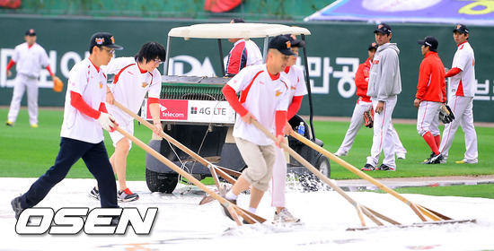 22일 오후 인천 문학구장에서 열리는 '2012 팔도 프로야구' SK 와이번스와 롯데 자이언츠의 플레이오프 5차전 경기에 앞서 SK 관계자가 방수포의 빗물을 제거하고 있다.