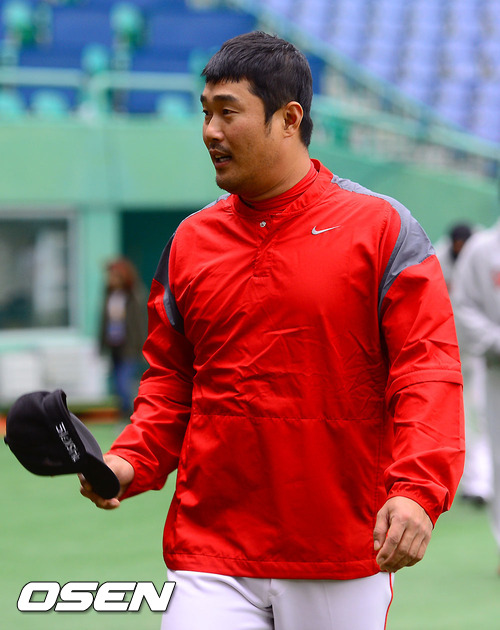 22일 오후 인천 문학구장에서 열리는 '2012 팔도 프로야구' SK 와이번스와 롯데 자이언츠의 플레이오프 5차전 경기에 앞서 SK 이호준이 훈련을 위해 그라운드에 나서고 있다.