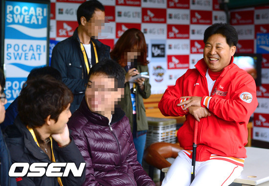 22일 오후 인천 문학구장에서 열리는 '2012 팔도 프로야구' SK 와이번스와 롯데 자이언츠의 플레이오프 5차전 경기에 앞서 SK 이만수 감독이 취재진과 인터뷰를 하고 있다.