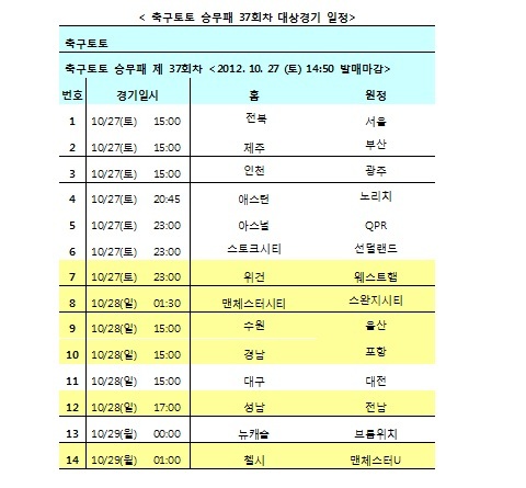 국민체육진흥공단(www.kspo.or.kr)이 발행하는 체육진흥투표권 수탁사업자인 스포츠토토(www.sportstoto.co.kr)는 오는 27일(토)부터 29일(월)까지 벌어지는 K리그 7경기와 잉글랜드 프리미어리그(EPL) 7경기 등 총 14경기를 대상으로 한 축구토토 승무패 37회차 게임을 발행한다고 밝혔다.
