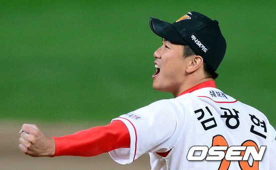 22일 오후 인천 문학구장에서 열린 '2012 팔도 프로야구' SK 와이번스와 롯데 자이언츠의 플레이오프 5차전, 1회초 SK 선발 김광현이 2사 만루에서 롯데 강민호를 삼진으로 잡고 기뻐하고 있다.