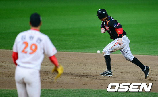 22일 오후 인천 문학구장에서 열린 '2012 팔도 프로야구' SK 와이번스와 롯데 자이언츠의 플레이오프 5차전, 2회초 1사2루에서 SK 김광현의 2루 송구가 뒤로 빠지자 롯데 박준서가 볼을 바라보며 3루로 향하고 있다.