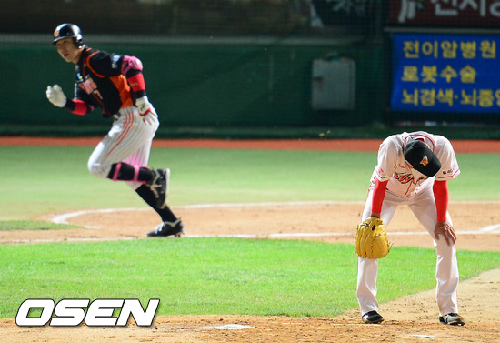 22일 오후 인천 문학구장에서 열리는 '2012 팔도 프로야구' SK 와이번스와 롯데 자이언츠의 플레이오프 5차전 경기 2회초 선두타자 박준서에게 우익수 앞 안타를 내준 김광현이 마운드에서 고개를 떨구고 있다.