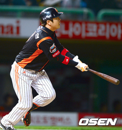 22일 오후 인천 문학구장에서 열린 2012 팔도 프로야구 SK 와이번스와 롯데 자이언츠의 플레이오프 5차전 경기 2회초 1사 3루 롯데 문규현이 선취타점 희생플라이를 날리고 있다