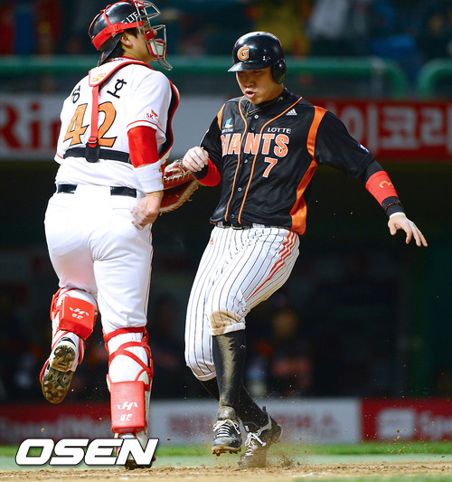 22일 오후 인천 문학구장에서 열린 2012 팔도 프로야구 SK 와이번스와 롯데 자이언츠의 플레이오프 5차전 경기 2회초 1사 3루 롯데 문규현의 희생플라이때 3루 주자 박준서가 선취득점을 올리고 있다