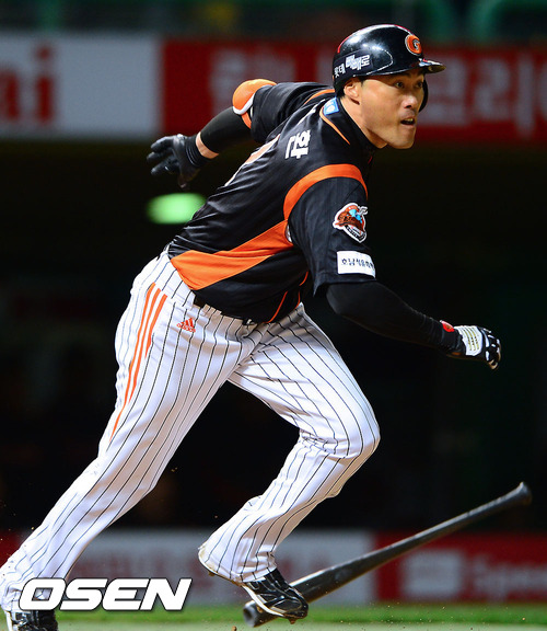 22일 오후 인천 문학구장에서 열린 2012 팔도 프로야구 SK 와이번스와 롯데 자이언츠의 플레이오프 5차전 경기 2회초 2사 2루 롯데 조성환이 1타점 적시타를 날리고 있다.