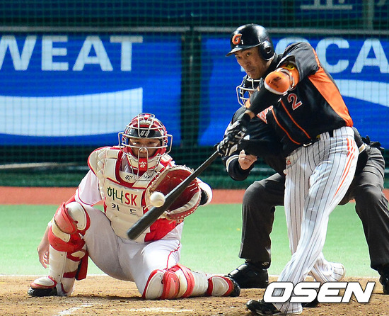 22일 오후 인천 문학구장에서 열리는 '2012 팔도 프로야구' SK 와이번스와 롯데 자이언츠의 플레이오프 5차전 경기 2회초 2사 2루 조성환이 1타점 적시타를 치고 있다.
