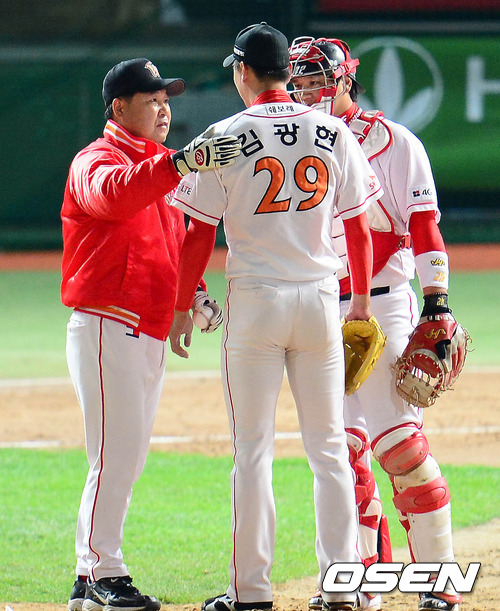 22일 오후 인천 문학구장에서 열리는 '2012 팔도 프로야구' SK 와이번스와 롯데 자이언츠의 플레이오프 5차전 경기 2회초 2사 김광현이 강판당하고 있다.
