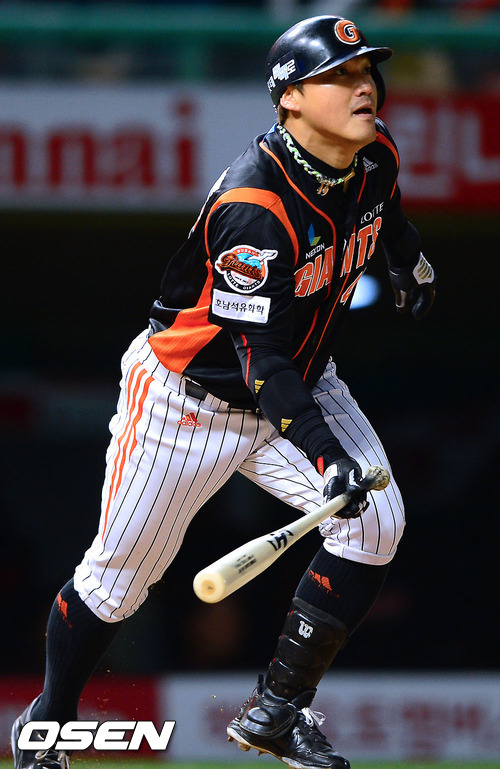 22일 오후 인천 문학구장에서 열린 2012 팔도 프로야구 SK 와이번스와 롯데 자이언츠의 플레이오프 5차전 경기 2회초 2사 1,2루 롯데 홍성흔이 1타점 적시타를 치고 타구를 바라보고 있다