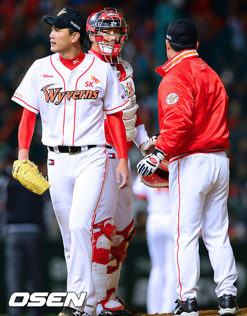 22일 오후 인천 문학구장에서 열린 2012 팔도 프로야구 SK 와이번스와 롯데 자이언츠의 플레이오프 5차전 경기 2회초 3실점 허용한 SK 김광현 선발투수가 강판되고 있다