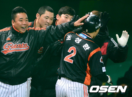 22일 오후 인천 문학구장에서 열린 '2012 팔도 프로야구' SK 와이번스와 롯데 자이언츠의 플레이오프 5차전, 2회초 2사1,2루에서 롯데 조성환이 홍성흔의 1타점 적시타에 홈을 밟고 동료선수들의 축하를 받고 있다. 조성환은 선발에서 제외된 박종윤의 1루수 자리에 선발 출장.