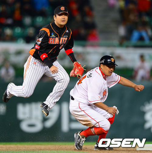 22일 오후 인천 문학구장에서 열린 2012 팔도 프로야구 SK 와이번스와 롯데 자이언츠의 플레이오프 5차전 경기 2회말 1사 1루 SK 박진만의 내야땅볼때 롯데 문규현 유격수가 1루주자 조인성을 포스아웃 시킨 후 병살아웃 시도하고 있다.