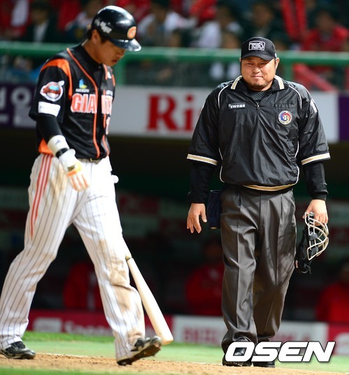 22일 오후 인천 문학구장에서 열린 2012 팔도 프로야구 SK 와이번스와 롯데 자이언츠의 플레이오프 5차전 경기 4회초 삼진을 당하고 물러나는 김주찬을 이영재 구심이 바라보고 있다.