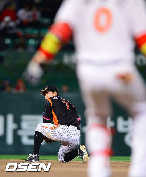 22일 오후 인천 문학구장에서 열린 2012 팔도 프로야구 SK 와이번스와 롯데 자이언츠의 플레이오프 5차전 경기 4회말 1사 2루 롯데 박준서가 SK 김강민의 내야땅볼을 실책으로 놓치며 동점을 허용하자 아쉬워하고 있다
