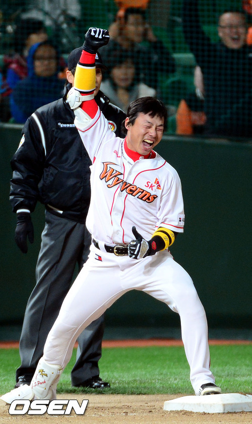 22일 오후 인천 문학구장에서 열리는 '2012 팔도 프로야구' SK 와이번스와 롯데 자이언츠의 플레이오프 5차전 경기, 5회말 1사 2루 SK 박재상이 역전 적시타를 때리고 3루에서 포효하고 있다.