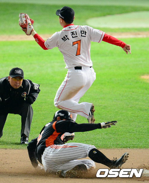 22일 오후 인천 문학구장에서 열리는 '2012 팔도 프로야구' SK 와이번스와 롯데 자이언츠의 플레이오프 5차전 경기 6회초 무사 1루 문규현의 타석, 1루주자 황재균이 도루에 성공하고 있다.