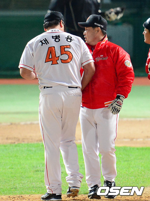 22일 오후 인천 문학구장에서 열리는 '2012 팔도 프로야구' SK 와이번스와 롯데 자이언츠의 플레이오프 5차전 경기 6회초 2사 3루, 채병용이 마운드를 내려가고 있다.