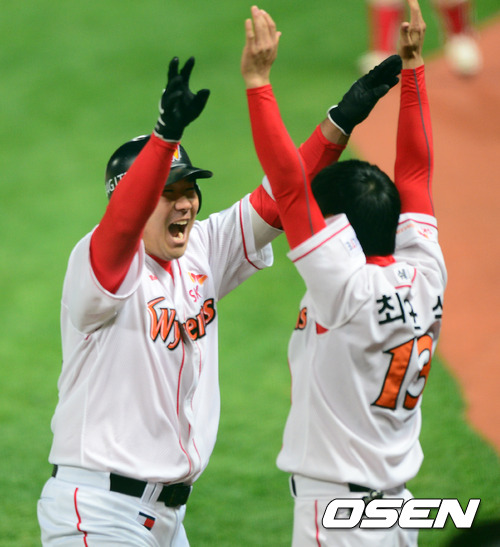 22일 오후 인천 문학구장에서 열린 '2012 팔도 프로야구' SK 와이번스와 롯데 자이언츠의 플레이오프 5차전, 7회말 1사 만루에서 대타로 나선 SK 이재원이 희생플라이로 타점에 성공하며 기뻐하고 있다.