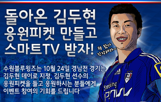 그 일환으로 빅버드 파크에서는 김두현을 위한 응원피켓 만들기 행사가 열리며 정성을 담아 응원피켓을 만드신 팬들에게는 이벤트를 통해 삼성 스마트 TV와 빕스, 에버랜드 이용권 등을 증정한다.