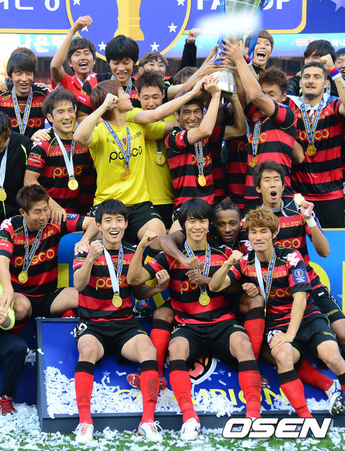포항 스틸러스가 4년 만의 FA컵 우승으로 환하게 웃고 있다. 지난 20일 열린 경남과 FA컵 결승전에서 연장 후반 15분에 터진 박성호의 결승골에 힘입어 우승을 차지한 포항은 K리그 성적과 관계없이 내년도 아시아축구연맹(AFC) 챔피언스리그에 출전하게 됐다. 올해 챔피언스리그서 아쉽게 조별리그 탈락한 포항으로서는 아쉬움을 만회할 기회를 잡게 됐다.
