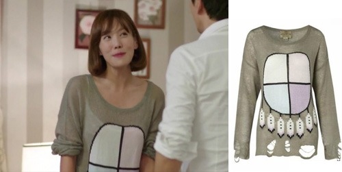 김정은은 KBS2 드라마 '울랄라부부‘에서 W브랜드의 에스닉한 프린트 니트를 입고 등장했다. 해당 니트는 쇄골라인이 드러나도록 깊게 파인 라운드 네크라인에 속이 비치는 시스루 스타일이다. 또, 밑단에 찢어지거나 구멍이 뚫린 디스트로이드 처리가 빈티지한 느낌을 준다.