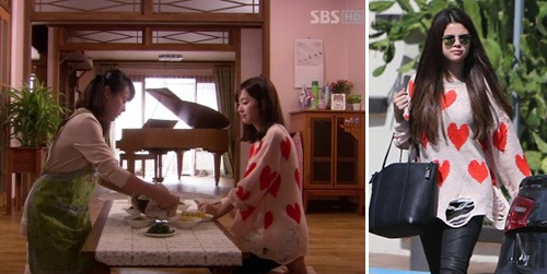 진세연은 SBS 드라마 ‘다섯손가락’에서 W브랜드의 빨간 하트가 패턴화 된 화이트 니트를 입고 등장했다. 해당 니트는 속이 비치는 시스루 스타일에 귀여운 분위기와는 다르게 밑단에 디스트로이드 처리가 됐다.