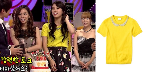 수지는 SBS 예능 프로그램 ‘강심장’에서 K브랜드의 노란색 칼라 니트를 입고 등장했다. 형광색 컬러감이 돋보이는 상의에 화려한 큐빅 장식의 네크라인이 포인트로 됐다.