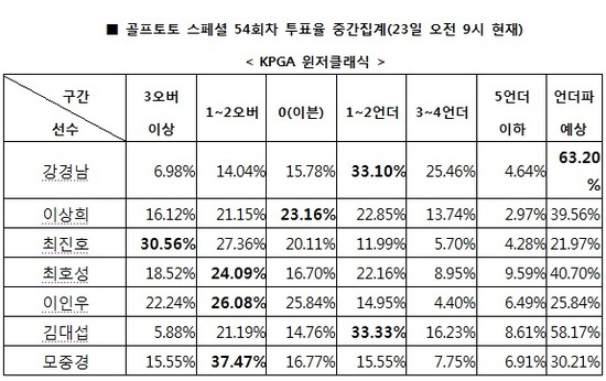 9월에 열린 '동부화재 프로미 오픈'에 이어 '코오롱 제55회 한국오픈'에서 우승을 차지하며 최근 절정의 감각을 과시하고 있는 김대섭의 언더파 예상이 58.17%로 집계돼 강경남의 뒤를 이었다. 반면 최호성(40.70%), 이상희(39.56%), 모중경(30.21%), 이인우(25.84%)의 언더파 예상은 비교적 낮게 나타났다.