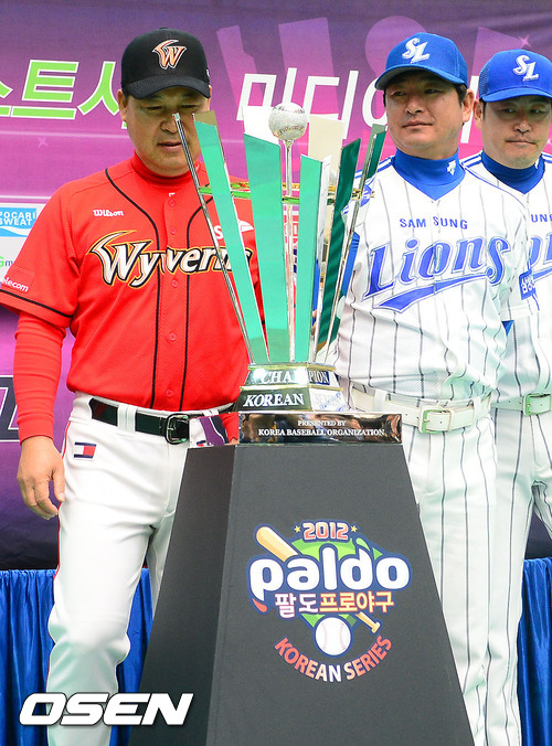 23일 오후 대구 종합운동장 내 실내체육관(대구구장 옆)에서 열린 2012 팔도 프로야구 한국시리즈 미디어데이 SK 이만수 감독과 삼성 류중일 감독이 우승 트로피를 바라보고 있다