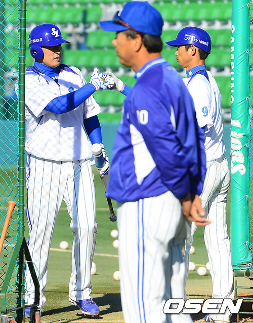 한국시리즈 1차전을 하루 앞둔 23일 오후 대구구장에서 삼성 이승엽과 강명구가 하이파이브를 하고 있다