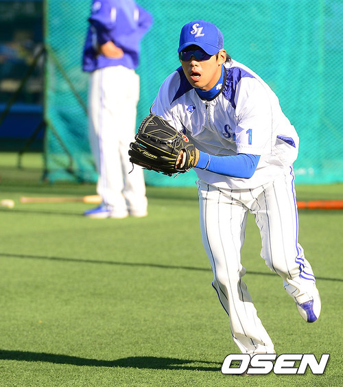 한국시리즈 1차전을 하루 앞둔 23일 오후 대구구장에서 1차전 선발로 나서는 윤성환이 수비 연습을 하고 있다