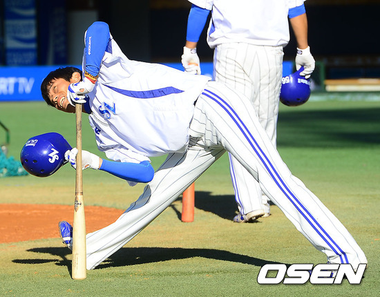 한국시리즈 1차전을 하루 앞둔 23일 오후 대구구장에서 삼성 강명구가 스트레칭으로 몸을 풀고 있다