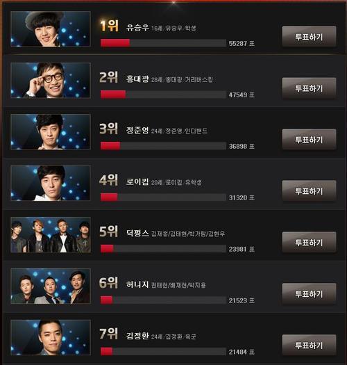득표율은 유승우가 23%, 홍대광이 20%이며, 3위 정준영이 15%, 4위 로이킴이 13%다.