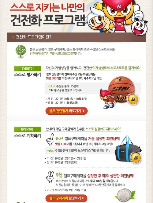 이번 캠페인 기간 동안 셀프진단평가에 참여한 모든 회원들에게는 벳볼 500개를 적립해주고 추첨을 통해 스타 농구공(15명)을 나눠준다. 또 셀프구매계획을 처음 설정한 회원들에게는 벳볼 1000개를 제공하고, 추첨을 통해 노스페이스 가방(15명)을 증정한다.