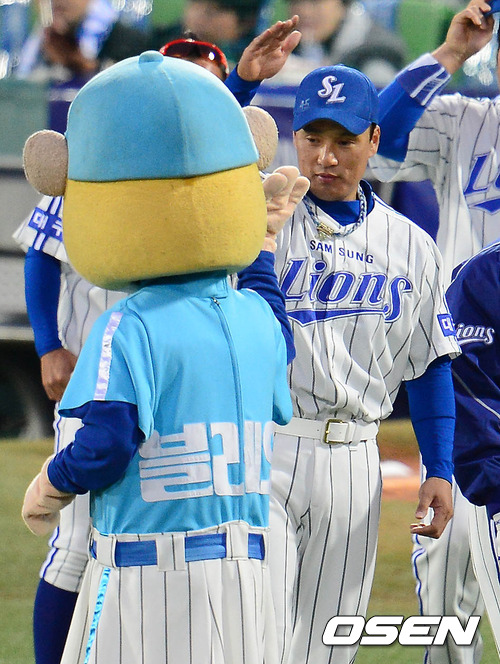 24일 오후 대구구장에서 열리는 '2012 팔도 프로야구' 삼성 라이온즈와 SK 와이번스 한국시리즈 1차전 경기 전 이승엽이 마스코트 블레오와 장난을 치고 있다.