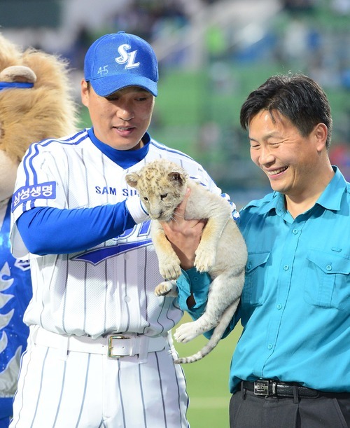 24일 오후 대구구장에서 열린 '2012 팔도 프로야구' 삼성 라이온즈와 SK 와이번스 한국시리즈 1차전 경기에 앞서 삼성 이승엽이 아기사자와 기념촬영을 마친후 사육사에게 건네주고 있다.