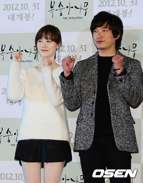 24일 오후 서울 왕십리 CGV에서 열린 배우 겸 감독 구혜선의 두 번째 장편영화 연출작 ‘복숭아나무’의 언론배급 시사회에서 구혜선과 조승우가 파이팅을 외치고 있다.