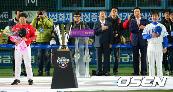 24일 오후 대구구장에서 열리는 '2012 팔도 프로야구' 삼성 라이온즈와 SK 와이번스 한국시리즈 1차전 경기 시작 전 이만수 감독과 류중일 감독이 국민의례 시간을 갖고 있다.