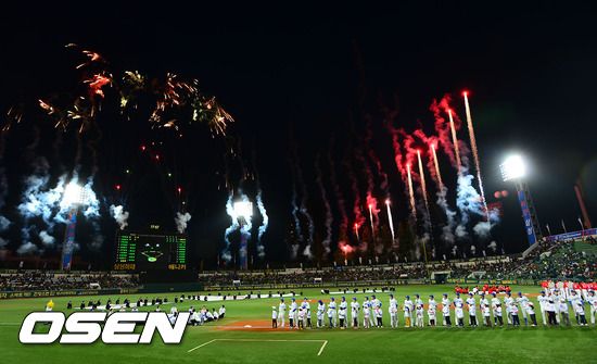 24일 오후 대구구장에서 열린 '2012 팔도 프로야구' 삼성 라이온즈와 SK 와이번스 한국시리즈 1차전, 경기에 앞서 개막 선언되고 있다
