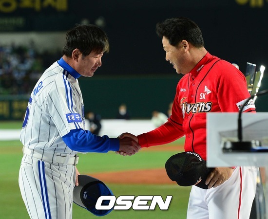 24일 오후 대구구장에서 열린 '2012 팔도 프로야구' 삼성 라이온즈와 SK 와이번스 한국시리즈 1차전 경기에 앞선 공식행사에서 양팀 감독이 인사를 나누고 있다.