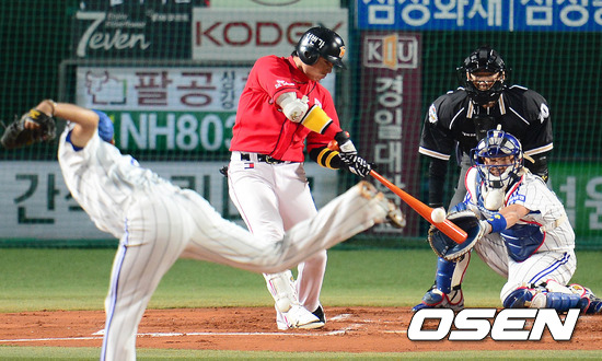 24일 오후 대구구장에서 열린 '2012 팔도 프로야구' 삼성 라이온즈와 SK 와이번스 한국시리즈 1차전 경기 1회초 1사 박재상이 좌전안타를 치고 있다.