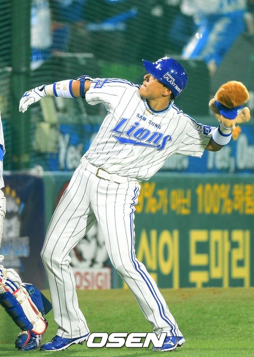 24일 오후 대구구장에서 열린 '2012 팔도 프로야구' 삼성 라이온즈와 SK 와이번스 한국시리즈 1차전 경기 1회말 1사 1루 삼성 이승엽 선취 좌월투런 홈런을 날리고 홈인 관중을 향해 마스코트 인형을 던져주고 있다.