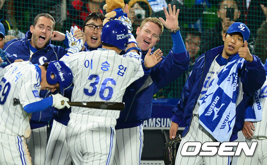24일 오후 대구구장에서 열린 '2012 팔도 프로야구' 삼성 라이온즈와 SK 와이번스의 한국시리즈 1차전, 1회말 1사 1루에서 삼성 이승엽이 선제 투런포를 날리고 동료선수들의 축하를 받고 있다
