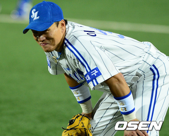 24일 오후 대구구장에서 열린 '2012 팔도 프로야구' 삼성 라이온즈와 SK 와이번스의 한국시리즈 1차전, 3회초 수비도중 삼성 이승엽이 SK 더그아웃을 바라보며 미소짓고 있다