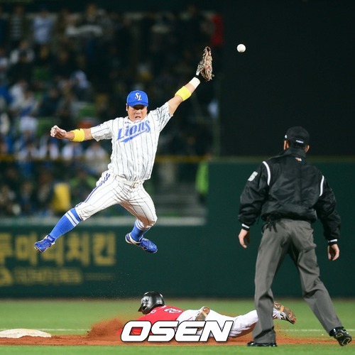 24일 오후 대구구장에서 열린 '2012 팔도 프로야구' 삼성 라이온즈와 SK 와이번스 한국시리즈 1차전 경기 4회초 1사 1루 최정 타석때 1루 주자 정근우 2루 도루에 성공하며 공이 빠진틈을 이용 3루까지 진루하였다.