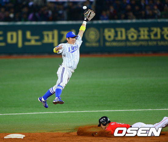 24일 오후 대구구장에서 열린 '2012 팔도 프로야구' 삼성 라이온즈와 SK 와이번스 한국시리즈 1차전, 4회초 1사 1루 SK 최정의 타석때 1루 주자 정근우가 공이 빠지는 사이 도루 성공하고 있다